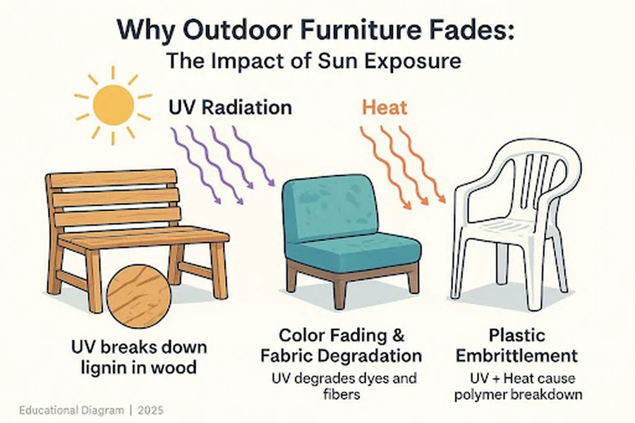 In fabrics, this breaks down dyes so colors fade and become patchy. In other materials, it can lead to cracking, loss of flexibility, and surface damage. The longer furniture sits unprotected in full sun, the worse and more permanent this damage becomes.